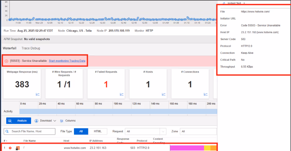 Am 25. August 2025, um 2:09 AM EDT, entdeckte Internet Sonar einen Ausfall, der Hotwire-Dienste in mehreren Regionen, einschließlich der USA und Kanada, beeinträchtigte. Während des Vorfalls lieferten Anfragen an https://www.hotwire.com/ ab 2:09 AM EDT von mehreren Standorten HTTP 504 (Gateway Timeout) und HTTP 503 (Service Unavailable) Antworten.