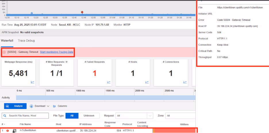 Am 20. August 2025, um 2:45 AM EDT, stellte Internet Sonar einen Ausfall fest, der Spotify-Dienste an mehreren Standorten im asiatisch-pazifischen Raum betraf. Während des Vorfalls lieferten Anfragen an clienttoken.spotify.com und apresolve.spotify.com HTTP 502 (Bad Gateway) und HTTP 504 (Gateway Timeout) Antworten.