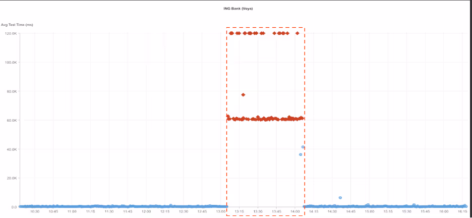 Am 13. August 2025, um 1:05 PM EDT, entdeckte Internet Sonar einen Ausfall, der die Dienste der ING Bank (Voya) beeinträchtigte. Während dieses Zeitraums wurden Anfragen an https://www.ing.com mit HTTP 504 Gateway Timeout beantwortet. Der Ausfall wurde etwa eine Stunde lang beobachtet, wobei die normale Funktionalität um 14:05 Uhr EDT wiederhergestellt war.