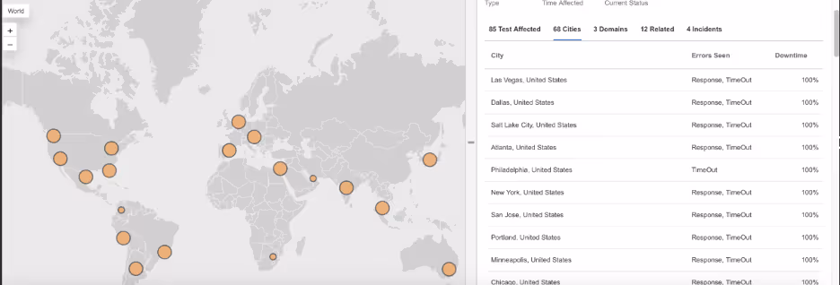 Ab 12:50 PM EST trat bei Optimizely ein weit verbreitetes Latenzproblem auf, das den Graph-Dienst betraf. Der Ausfall betraf Anfragen an cdn.optimizely.com und www.optimizely.com, wobei in mehreren Tests in verschiedenen Regionen Ausfälle beobachtet wurden. Catchpoint's Internet Sonar entdeckte das Problem frühzeitig und bestätigte Antwortzeitüberschreitungen und Leistungseinbußen in 68 Städten. Optimizely bestätigte den Vorfall später auf seiner Statusseite und gab an, dass um 17:41 UTC ein Fix bereitgestellt wurde, obwohl die Überwachung noch andauerte.