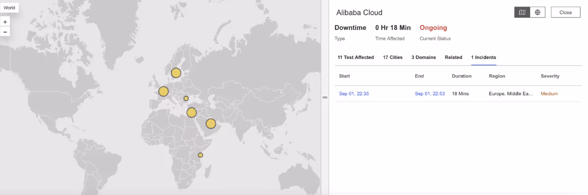 Die Mischung aus Fehlern zeigt Stress in verschiedenen Bereichen der Alibaba Cloud-Infrastruktur - von Serverüberlastungen bis hin zu Grenzen bei der Bearbeitung von Anfragen. Mit der synthetischen Überwachung von verteilten Standorten aus können Unternehmen den Umfang von Ausfällen bestätigen und Arbeitslasten in nicht betroffene Regionen umleiten, um die Serviceverfügbarkeit aufrechtzuerhalten.
