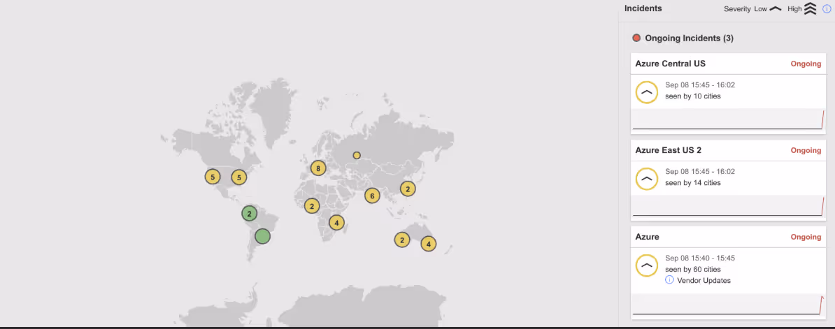Dieser Vorfall ereignete sich innerhalb von 24 Stunden nach einem separaten CrowdStrike-Ausfall, was in den Medien zu Verwirrung führte, da beide Probleme gleichzeitig gemeldet wurden. Unternehmen, die sich ausschließlich auf Azure verlassen und keine Multi-Regionen- oder Multi-Cloud-Strategien verfolgen, waren erheblich betroffen, insbesondere diejenigen, die eCommerce-APIs verwenden. CatchpointInternet Sonar erkannte den Ausfall frühzeitig und half dabei, das Problem einzugrenzen und zu bestätigen, dass es nicht mit Netzwerkproblemen zusammenhing, wodurch Zeit für unnötige Fehlersuche gespart wurde.