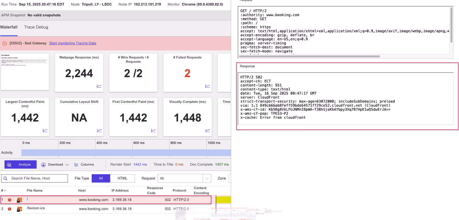 Am 23. Juli, von 14:35 bis 14:52 Uhr, trat auf der Website von Alaska Airlines (www.alaskaair.com) ein 404 Not Found-Fehler auf, der die Website für etwa 20 Minuten unzugänglich machte. Catchpoint erkannte das Problem und bestätigte die Fehler in mehreren Tests. Die Antwort-Header wiesen darauf hin, dass das Problem von Konfigurationsfehlern herrührte, was durch den 404-Fehler und die anschließenden Cache-Miss-Antworten belegt wurde.