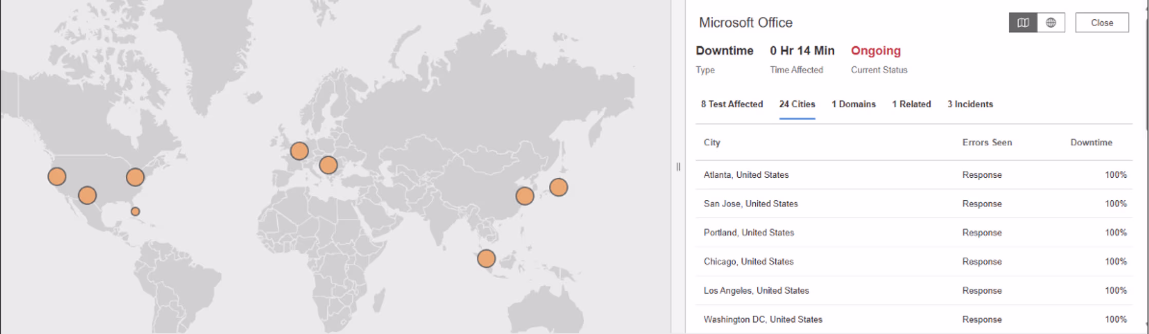 Dieser Ausfall wurde wahrscheinlich durch eine vorübergehende Serverüberlastung oder einen Konfigurationsfehler verursacht. Die schnelle Wiederherstellung deutet darauf hin, dass Microsofts Backup-Systeme gegriffen haben und den Dienst wiederhergestellt haben. Das Problem dabei ist, dass Microsoft Office von Millionen Menschen genutzt wird. Ein proaktives Internet Performance Monitoring (IPM) stellt sicher, dass selbst kurze Unterbrechungen erkannt, gemessen und verstanden werden und hilft IT-Teams, die Ausfallsicherheit zu überprüfen und die Benutzerfreundlichkeit zu verbessern.