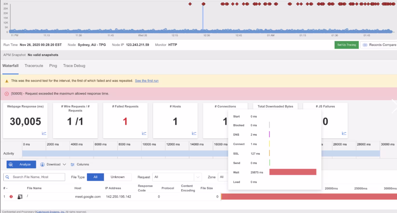 Um ca. 06:55 Uhr UTC entdeckte der Internet-Sonar von Catchpointeinen großflächigen Ausfall der AWS-Infrastruktur, 16 Minuten bevor AWS um 07:11 Uhr UTC offiziell seine Statusseite aktualisierte. Während des Vorfalls gaben mehrere auf AWS gehostete Dienste - darunter mehrere Autodesk-Umgebungen - HTTP 500 (Internal Server Error) und HTTP 502 (Bad Gateway) Antworten zurück.
