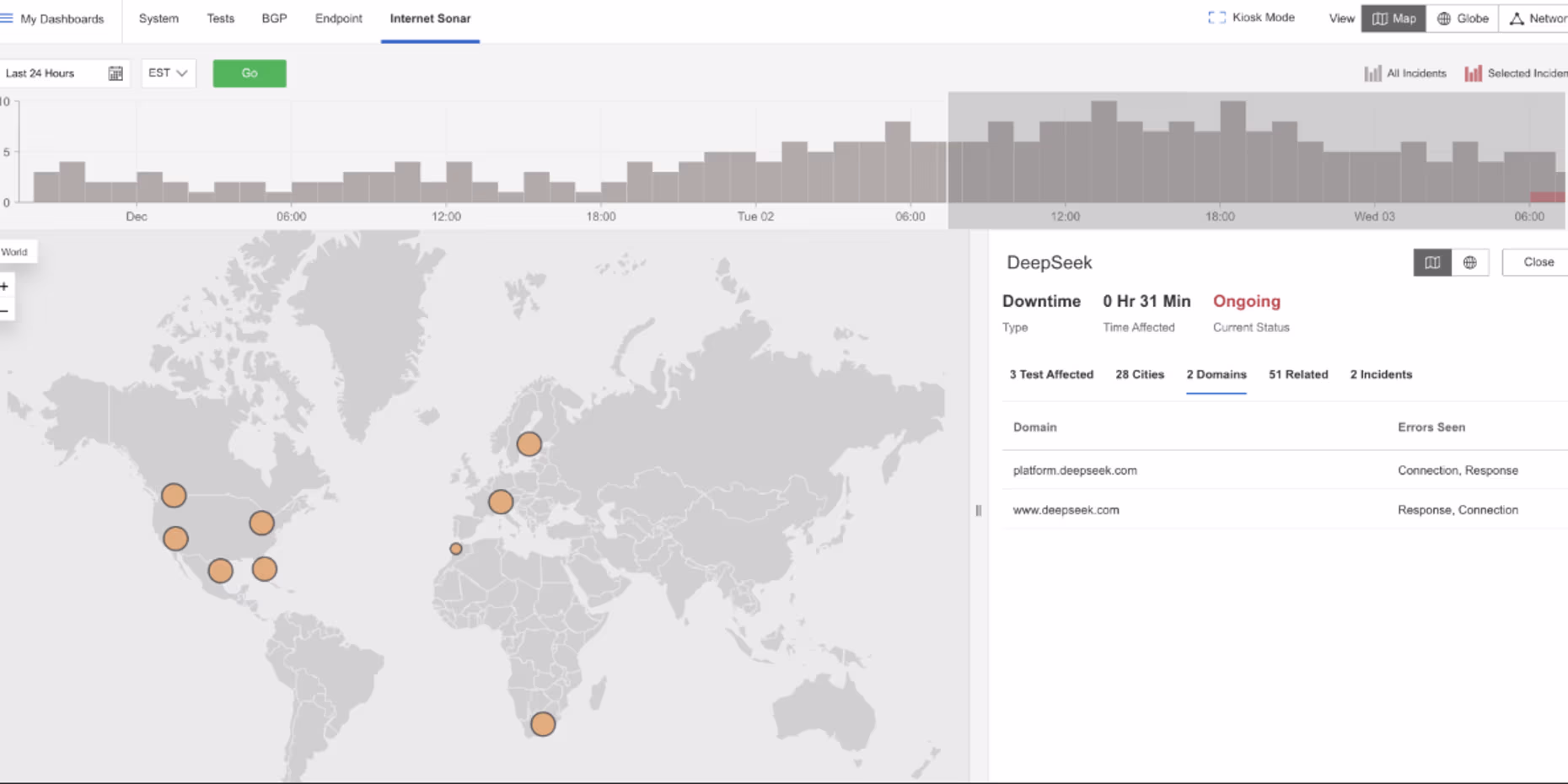 Langsame Verbindungen und Ausfälle können auf DNS-Probleme, Routing-Probleme oder Serverüberlastungen hinweisen. Für KI-Anbieter beeinträchtigen diese Störungen die Zuverlässigkeit. Durch die Überwachung von DNS und BGP (dem Routing-System des Internets) kann schnell festgestellt werden, ob die Ausfälle von der Netzwerkebene oder den Servern selbst ausgehen.