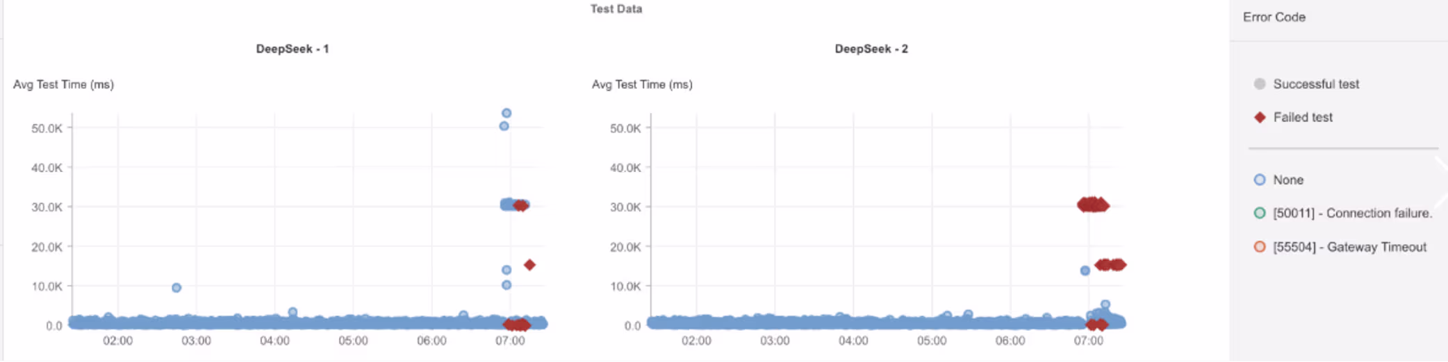 Am 3. Dezember 2025 um 06:55 EST stellte Internet Sonar einen Ausfall fest, der DeepSeek-Dienste in mehreren Ländern betraf, darunter die USA, Kanada, Indien und Deutschland. Anfragen an https://platform.deepseek.com/ und https://www.deepseek.com/ führten zu langen Wartezeiten und der Rückgabe des HTTP-Fehlers 504 (Gateway-Zeitüberschreitung – der Server erhielt keine rechtzeitige Antwort von einem Upstream-Server).